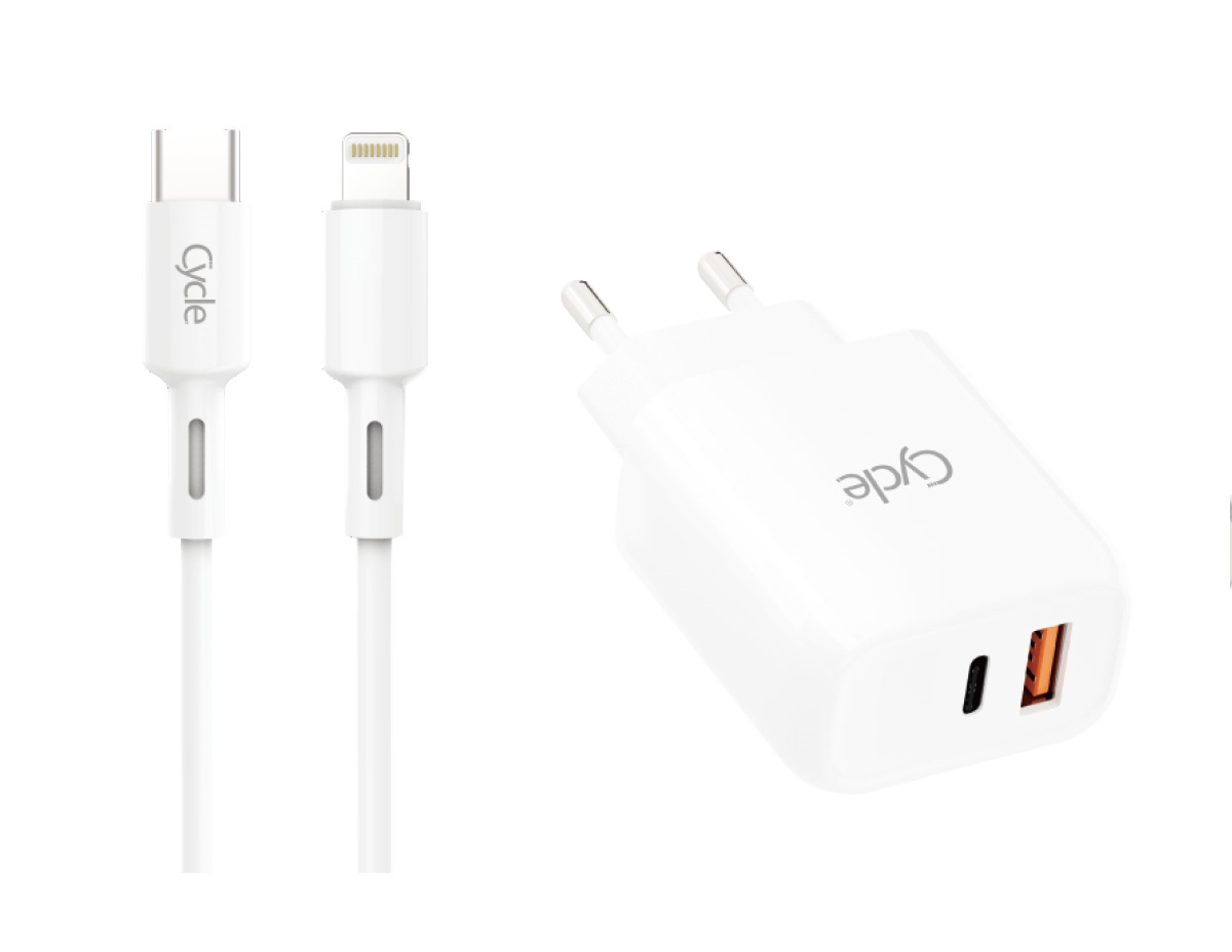 מטען קיר מהיר Cycle PD+QC 25W עם תמיכה בטכנולוגיות Power Delivery ו-Quick Charge, כולל כבל לייטנינג איכותי לטעינת מכשירי אפל במהירות ובבטיחות.