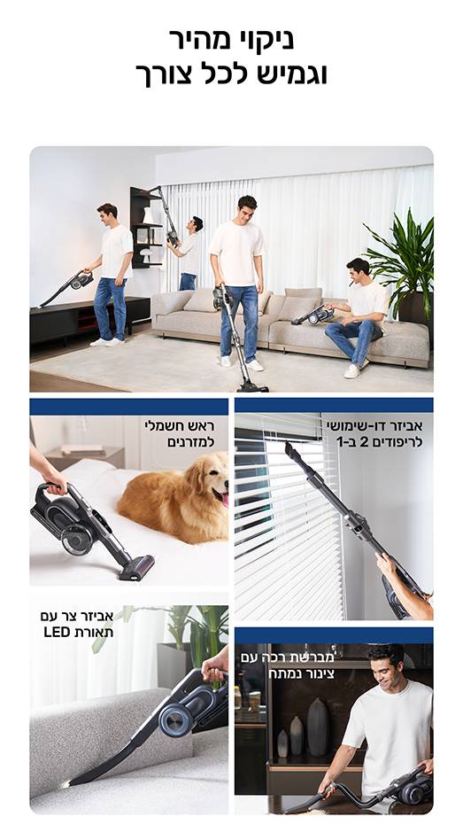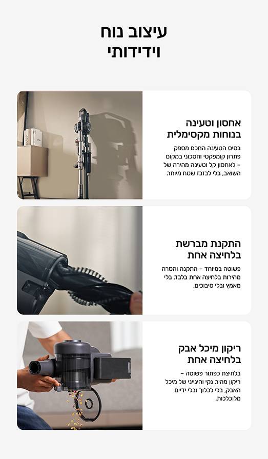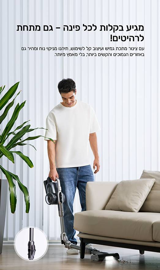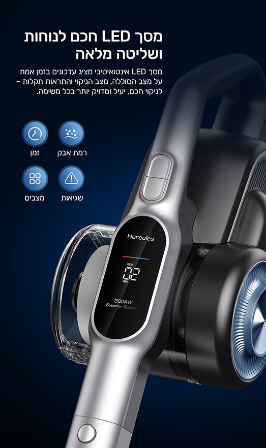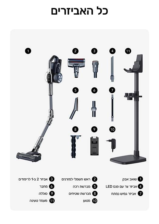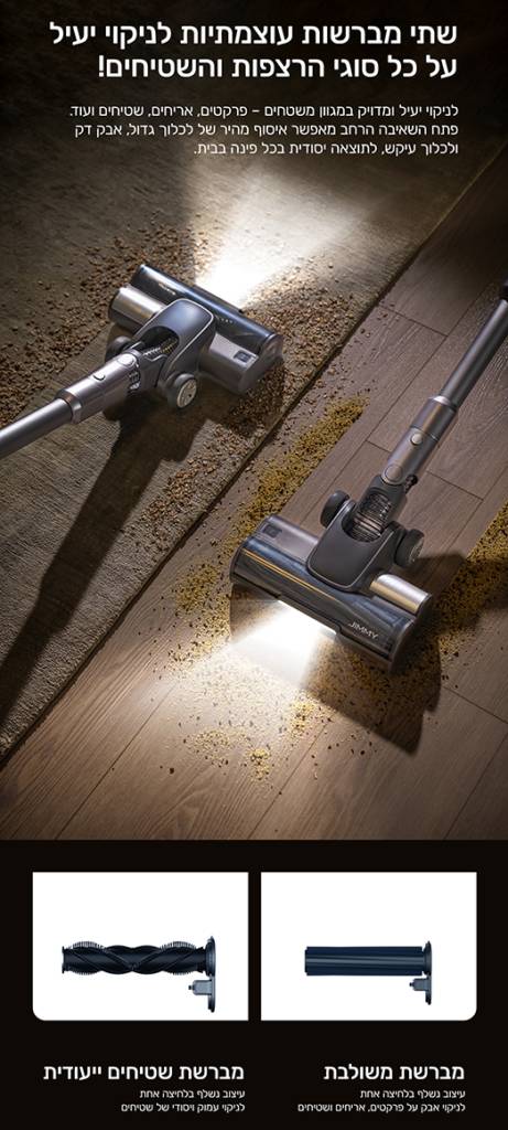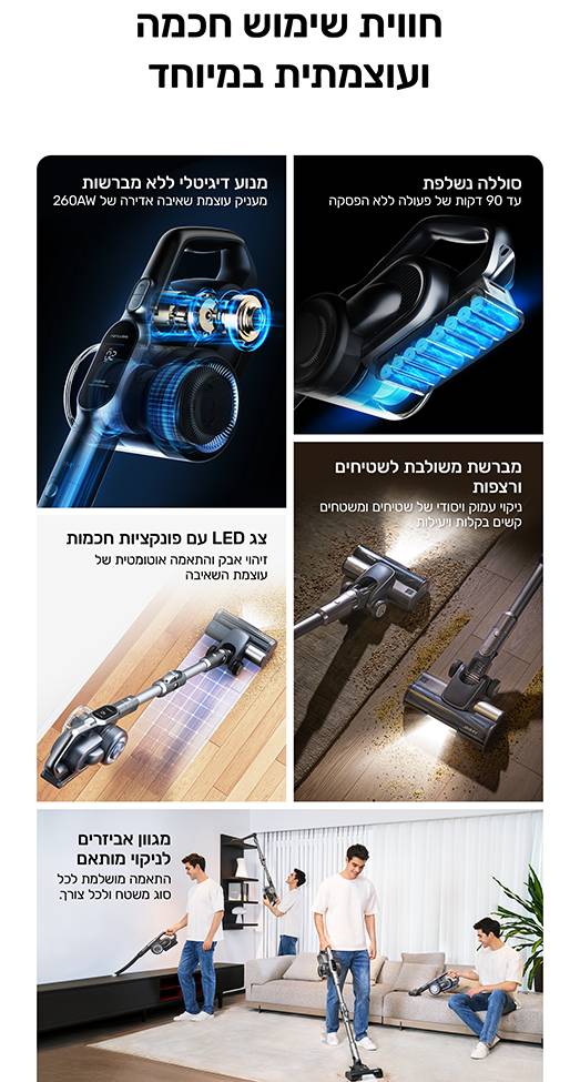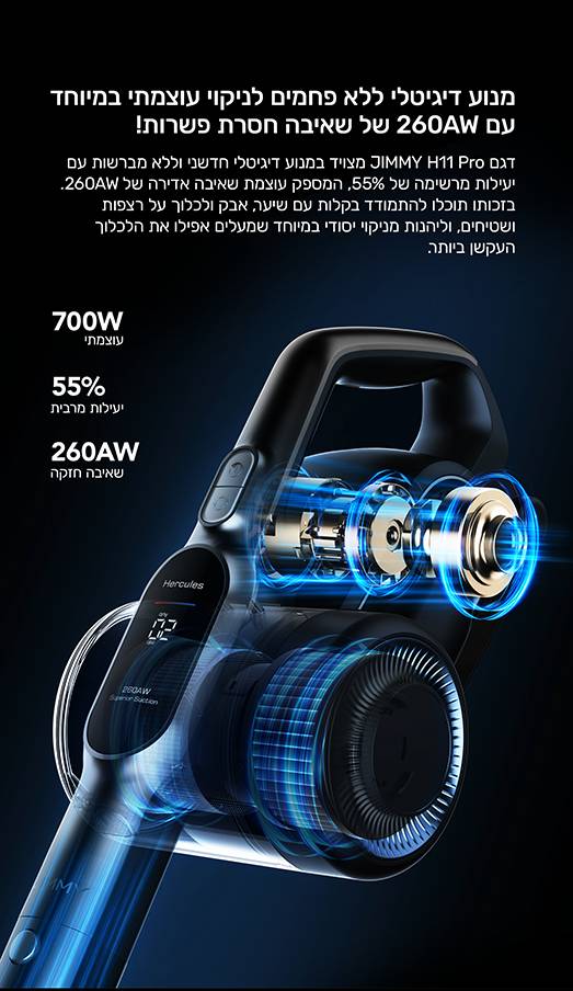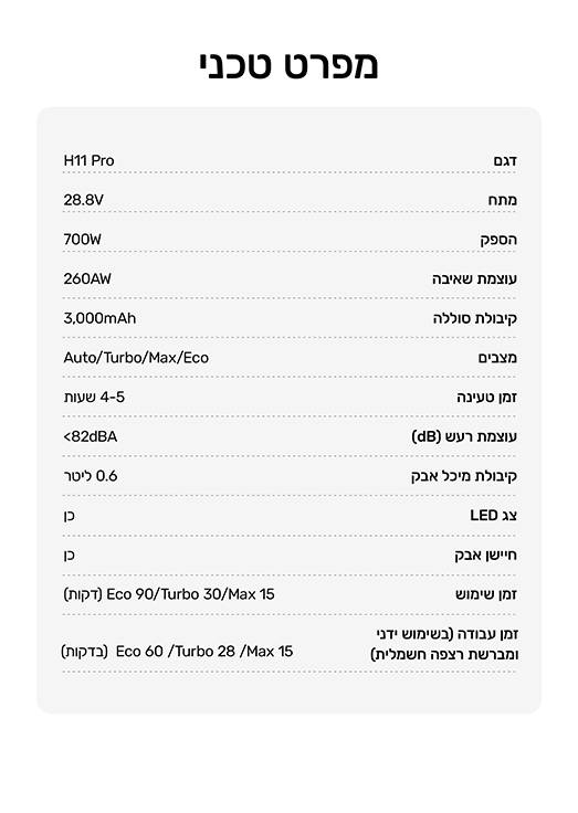 H11 Pro -שואב אבק חכם ועוצמתי במיוחד ! מנוע דיגיטלי ללא מברשות לעוצמת שאיבה אדירה של 260AW מברשת משולבת לשטיחים ורצפות – ניקוי עמוק ויסודי של שטיחים ומשטחים בקלות עיצוב ציקלון אופקי בפטנט ייחודי לשמירה על עוצמת שאיבה יציבה צג LED עם פונקציות חכמות – זיהוי אבק והתאמה אוטומטית של עוצמת השאיבה מגוון אביזרי ניקוי