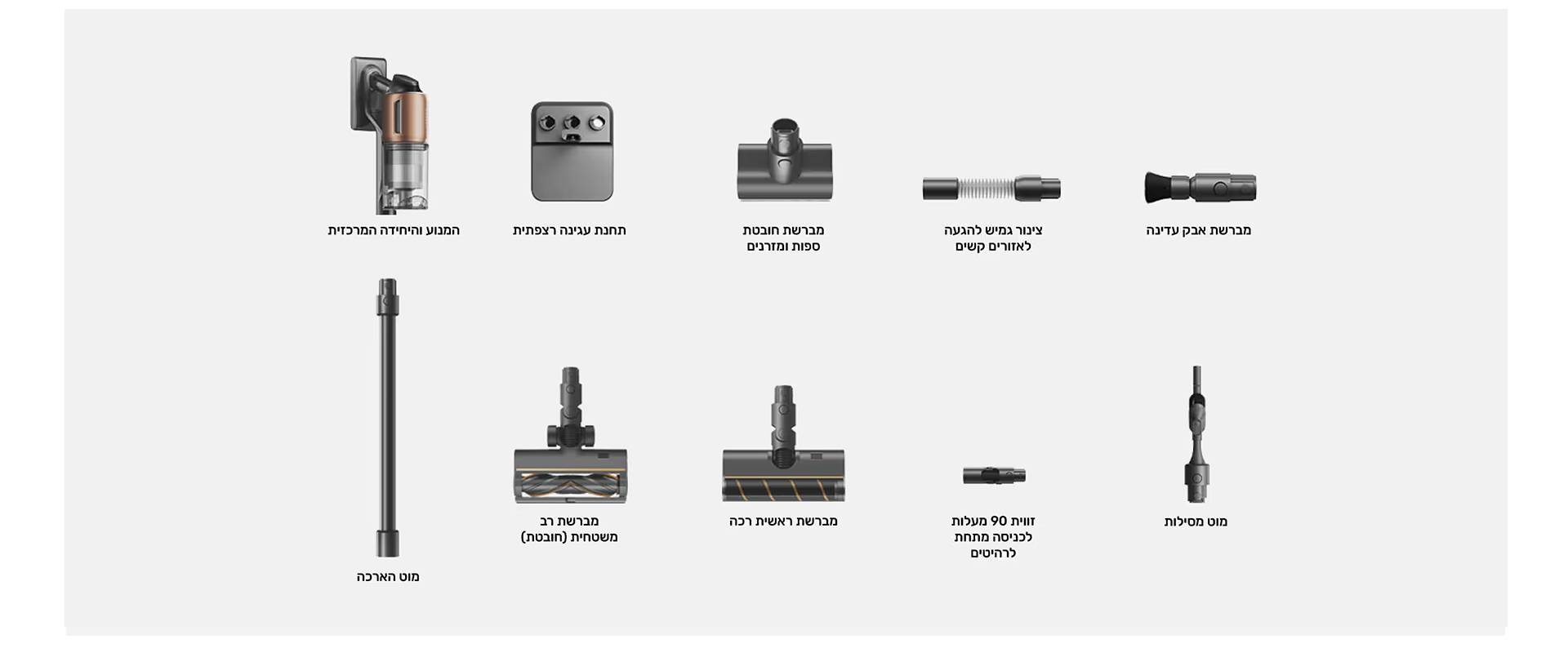 זמן עבודה מירבי של עד 90 דק’, השואב יכול להגיע לכל פינה בבית בזכות מגוון אביזרים לניקוי רב תכליתי ומקיף. כולל ניקוי עמוק של בדים, ספות, שטיחים, רהיטים וכל פינה בבית.
