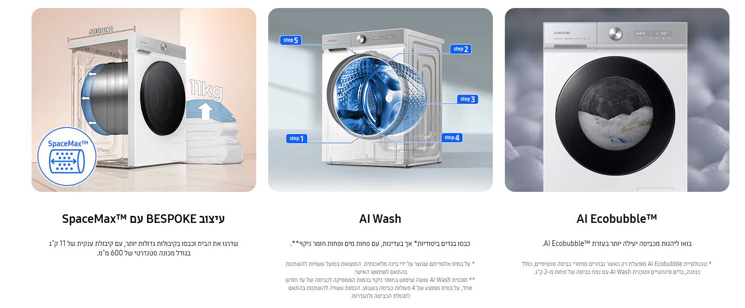 קיבולת עד 11 ק"ג מהירויות סחיטה: 0,400,800,1000,1200,1400 סל"ד תפריט הפעלה בעברית ואנגלית לבחירת המשתמש Eco Bubble Ai טכנולוגיה פורצת גבולות אשר נותנת את תוצאות הכביסה הטובות ביותר, שומרת על איכות ומאריכה את חיי הבגדים על ידי זיהוי סוג הבד ורמת הלכלוך הכביסה מתבצעת בקצף סבון, שנספג בבגדים פי 40 יותר מהר מאשר מים ומפרק את הלכלוך לעומק מכונה בעלת טכנולוגיית AI הלומדת את הרגלי השימוש שלכם ומתאימה את התוכניות בהתאם