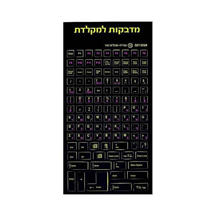 מדבקות למקלדת עברית- אותיות עברית-אנגלית צבעוניות זוהרות על רקע שחור אטום. מאפשר עבודה בחושך.