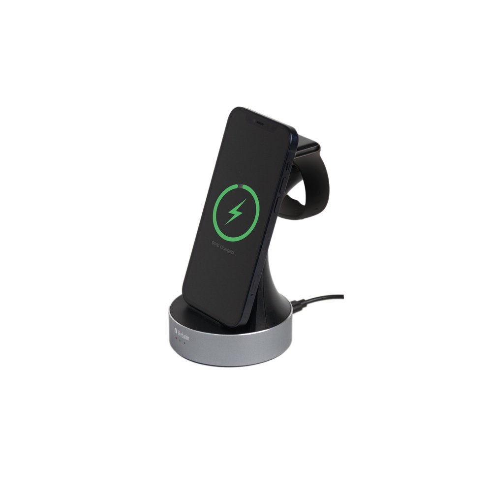 משטח טעינה Verbatim Aluminium 2-in-1 Qi MFi עם מטען לאפל ווטש בצבע כסף