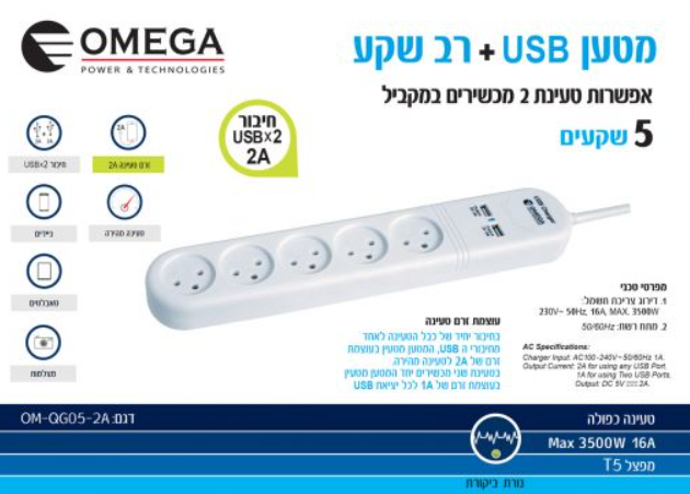 רב שקע 5 עם מטען 2 יציאות USB דגם OM-QG05-2A omega