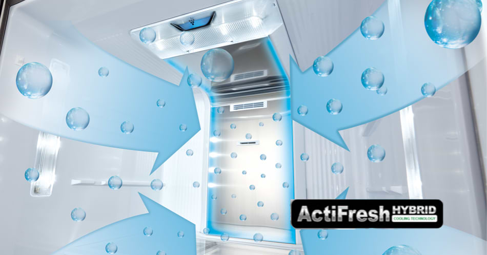 טכנולוגיה זו גם הופכת את מולקולות המים הנכנסות לתוך המקרר ללחות ומונעת את התייבשות המזון. טכנולוגייתActiFresh Hybrid Cooling שומרת על טריות המזון לאורך זמן.