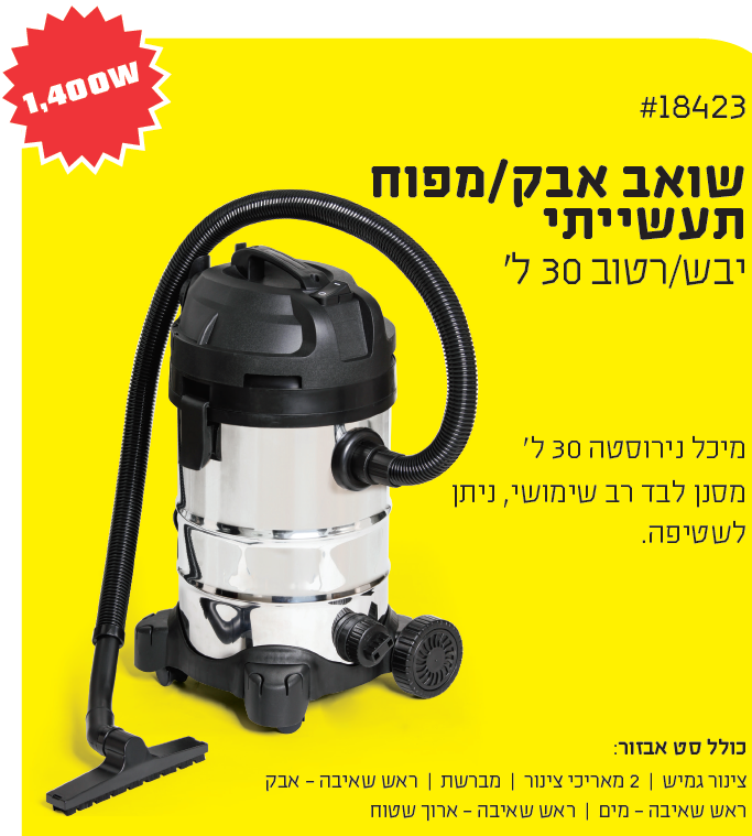 שואב אבק רטוב/יבש מיכל נירוסטה 30 ל' מחיר 616 ₪ גלגלת צינור גינה מקצועית 20 מטר מחיר 169 ₪ במקום 199 ₪ ג'ילדה איכותית 35X45 ס"מ מחיר 29 ₪ במקום 39 ₪ מנקה ריפוד עם מברשת - TURTLE WAX מחיר 45 ₪ במקום 79 ₪ מגב משולב ספוג ידית טלסקופית לניקוי שמשות הרכב מחיר 45 ₪ במקום 99 ₪ סוללה C אלקליין אולטרה 2 יחידות GP מחיר 19 ₪ במקום 45 ₪