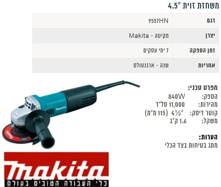משחזת זוית "5 9565CR מתוצרת Makita מחיר 651 ₪ סט 101 חלקים ביטים ומקדחים MAKITA P67832 מקיטה מחיר 139 ₪ מברגה 18V דגם DDF453 + סוללה 1.5AH מבית Makita מחיר 555 ₪ במקום 617 ₪ רוטר 930W דגם 3601B מבית MAKITA מחיר 1,118 ₪ משור אנכי דגם DJV182 כולל 2 סוללות 5AH מבית Makita מחיר 1,670 ₪ גוף מספרי פח נטענים 18V דגם BJS161Z מבית MAKITA מחיר 1,448 ₪