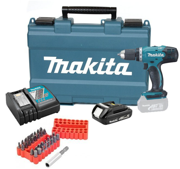 מברגה/מקדחה 18V סוללה 1.5AH ומטען DDF453RYE במזוודה+32 ביטים, יבואן רשמי Makita