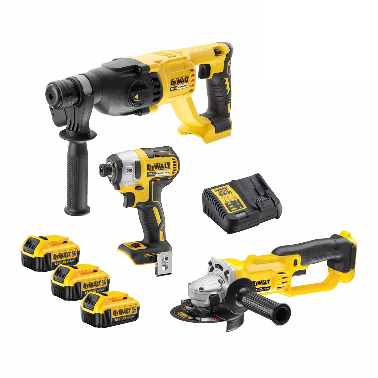 סט 3 כלים 18V פטישון+אימפקט+משחזת זווית+3 סוללות 4AH דגם DCK307M3 DEWALT