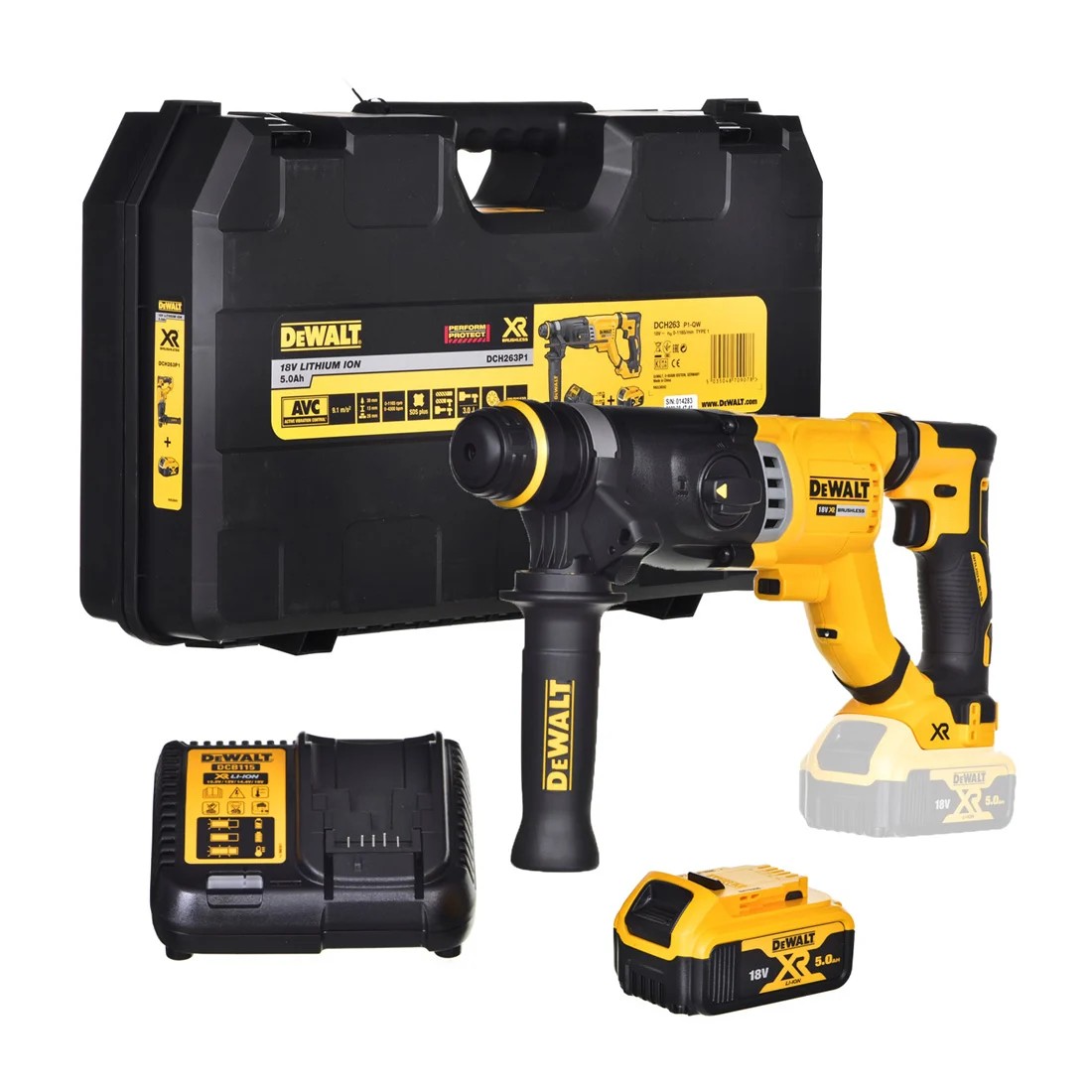 סוללת ליתיום 18V 5.0Ah מסדרת XR מטען מנוע ללא פחמים BRUSHLESSויסות אלקטרוני 0-1,165 סל"ד 0-4,300 פל"ד עוצמת הלימה 3.0J 3 מצבי עבודה כושר קידוח בבטון 28 מ"מ כושר קידוח בברזל 13 מ"מ כושר קידוח בעץ 30 מ"מ בארגז מסדרת TSTAK משקל 2.7 ק"ג גוף בלבד: DCH263N