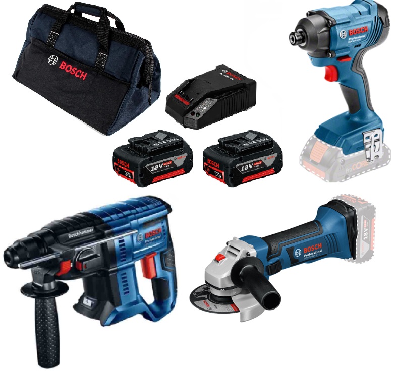 סט 18V פטישון+אימפקט+משחזת 2 סוללות 4AH Bosch