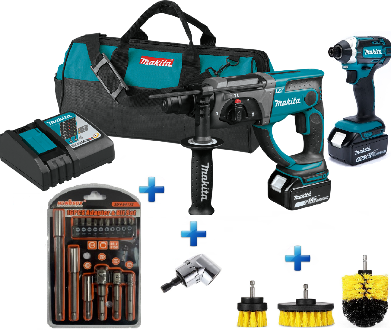 סט 18V פטישון+אימפקט 2 סוללות 4AH+מתנות שוות DLX2166M + סט 101 חלקים ביטים ומקדחים MAKITA + מזוודת 13 יח' מקדחים ואזמלים לפטישון MAKITA + סט 5 מקדחי SDS לפטישון 4 ראשים לבטון מזויין BOSCH + סט ביטים 71 חלקים חזקים במיוחד לאימפקט במארז קשיח ROHER-PRO + סט מקדחים 5-10 רב תכליתי SDS PLUS לקידוח באבן, בטון, מתכות, עץ ועוד ALPEN =