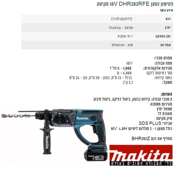 - פטישון 18V נטען + 3 סוללות 4AH דגם DHR202RFE מבית MAKITA