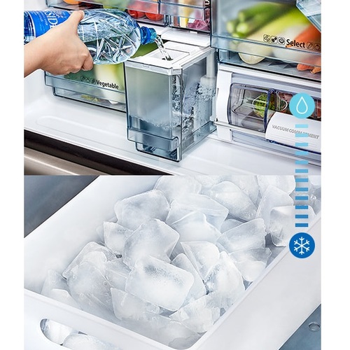 מתקן לייצור קרח הבנוי בדלת תא המקפיא, להכנה והוצאה קלה של קוביות הקרח, ללא חיבור למים.