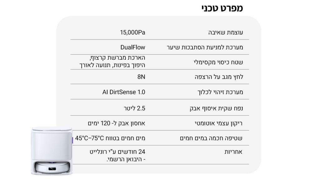 שאיבה עוצמתית של 15,000 Pa Suction Hyper של 15,000 Pa מפנה 99% מהחלקיקים מרצפות קשות, ומשתמשת בחיישן חלקיקים שמגביר בעלייה של עד 70% כאשר מזהה לכלוך