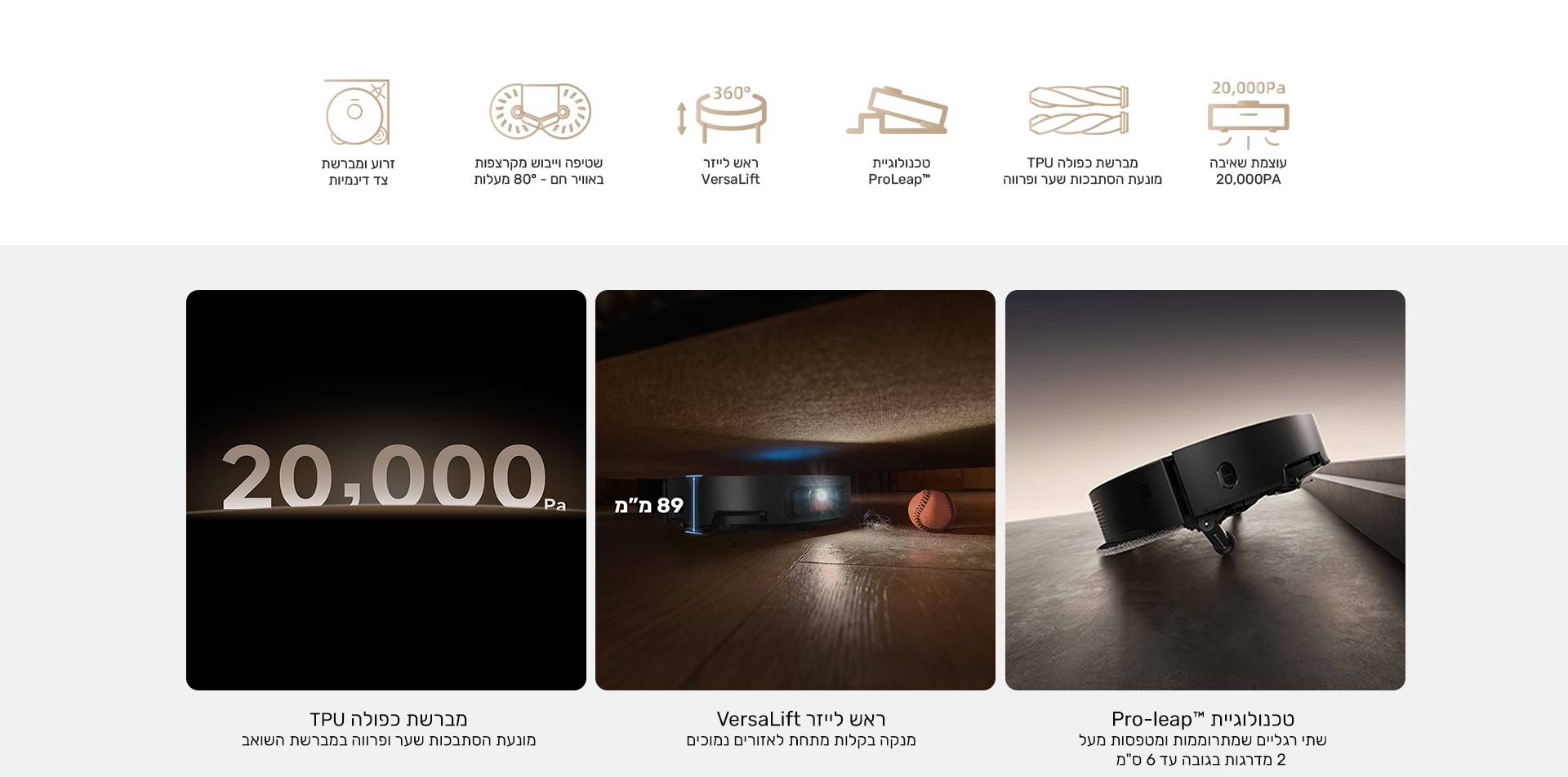 טכנולוגיית Pro-leap™- מטפס מעל 2 מדרגות בגובה עד 6 ס"מ או מעגל מדרגה בודדת בגובה עד 4.2 ס"מ טכנולוגיית ניווט ersa-lift – מנמיך את גובהו ל-8.95 ס"מ ולנקות ביעילות מתחת לרהיטים נמוכים. חיישן AI המזהה עד 200 מכשולים ב- ° 360 גם בחושך מברשת כפולה- מונעת הסתבכות שער ופרווה במברשת השואב פקודות קוליות לשואב- ללא צורך בהתחברות לאפליקציה