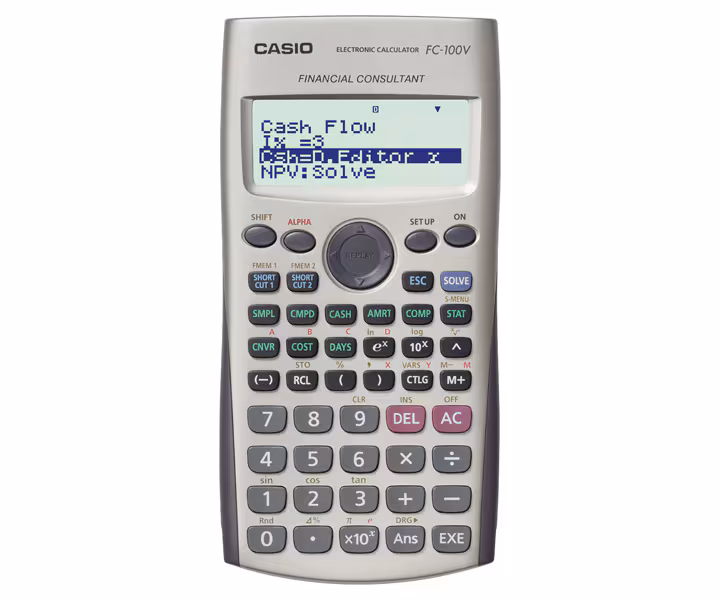 מחשבון פיננסי Casio FC-100V הוא מחשבון מקצועי המיועד לחישובים כלכליים, חישובי ריבית, השקעות, הלוואות, אנונות, והמרות מטבע. הוא כולל תצוגת מסך דו-שורה, מקשים ייעודיים לפונקציות פיננסיות, ותפריט אינטואיטיבי המאפשר ניווט מהיר בין חישובים. מתאים לסטודנטים למנהל עסקים, חשבונאות, כלכלה, ולבעלי מקצוע בתחום הפיננסי.