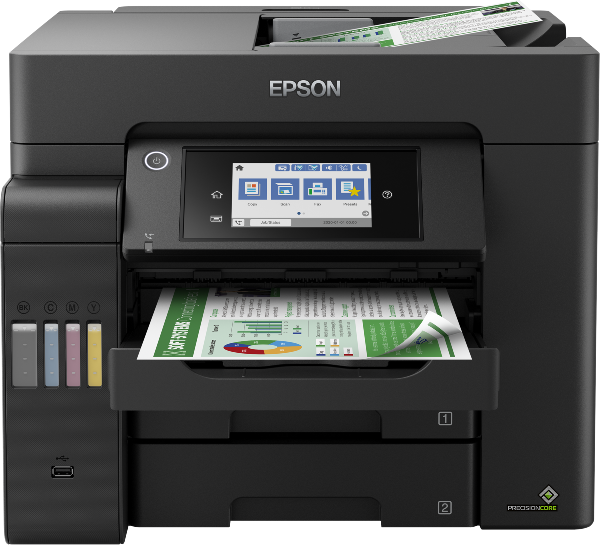 • באמצעות מדפסת EcoTank קלה לשימוש זו, שמספקת עלות הדפסת עמוד נמוכה במיוחד, ניתן להדפיס, לסרוק, לצלם ולשלוח פקס. ‏‫ניתן לבצע משימות בזריזות הודות למהירויות ההדפסה והסריקה הגבוהות, שני מגשי הזנה קדמיים של 250 גיליונות, מגש הזנה אחורי של 50 גיליונות ומזין מסמכים אוטומטי (ADF) של 50 גיליונות.‬ אפשר להדפיס איך שרוצים באמצעות הדפסה ממכשירים ניידים, Ethernet ומסך מגע LCD בגודל 10.9 ס"מ.