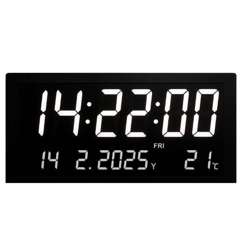 שעון קיר דיגיטלי גדול ומרשים בגודל ‎28X15X3.6 ס"מ, עם תצוגת LED בהירה וברורה לקריאה נוחה מכל זווית. השעון מציג שעות, דקות ושניות לצד תאריך, יום בשבוע וטמפרטורה, מה שהופך אותו לפתרון אידיאלי לשימוש בבית, במשרד, בכיתה או בכל חלל ציבורי. עיצוב מודרני ופונקציונלי המוסיף סדר ואלגנטיות לכל סביבה.