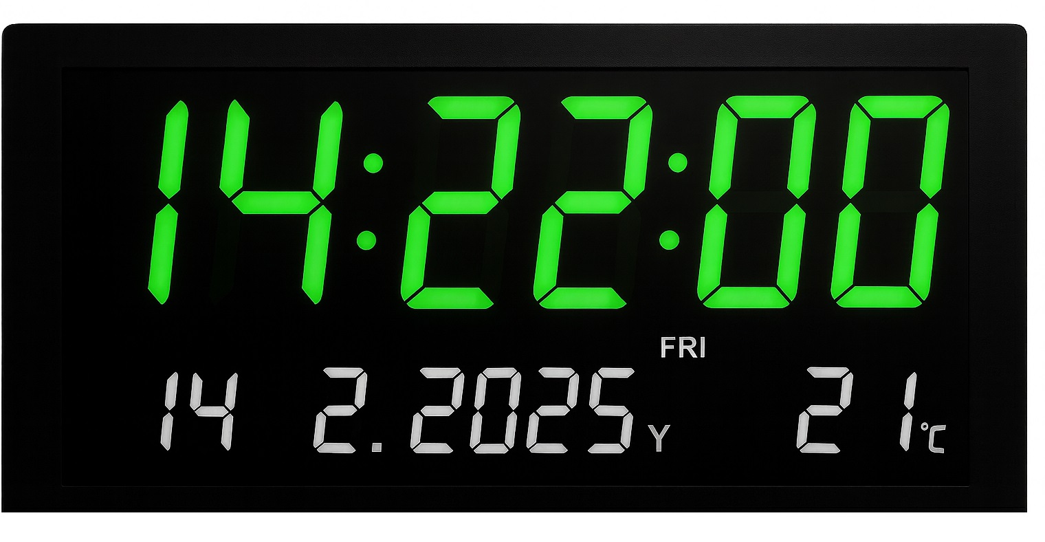 שעון קיר דיגיטלי גדול ומרשים בגודל ‎28X15X3.6 ס"מ, עם תצוגת LED בהירה וברורה לקריאה נוחה מכל זווית. השעון מציג שעות, דקות ושניות לצד תאריך, יום בשבוע וטמפרטורה, מה שהופך אותו לפתרון אידיאלי לשימוש בבית, במשרד, בכיתה או בכל חלל ציבורי. עיצוב מודרני ופונקציונלי המוסיף סדר ואלגנטיות לכל סביבה.