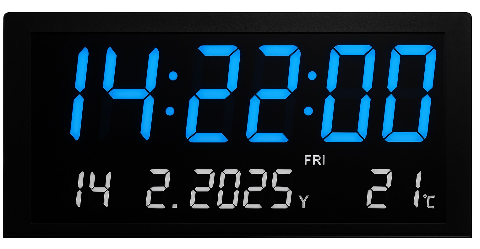 שעון קיר דיגיטלי גדול ומרשים בגודל ‎28X15X3.6 ס"מ, עם תצוגת LED בהירה וברורה לקריאה נוחה מכל זווית. השעון מציג שעות, דקות ושניות לצד תאריך, יום בשבוע וטמפרטורה, מה שהופך אותו לפתרון אידיאלי לשימוש בבית, במשרד, בכיתה או בכל חלל ציבורי. עיצוב מודרני ופונקציונלי המוסיף סדר ואלגנטיות לכל סביבה.