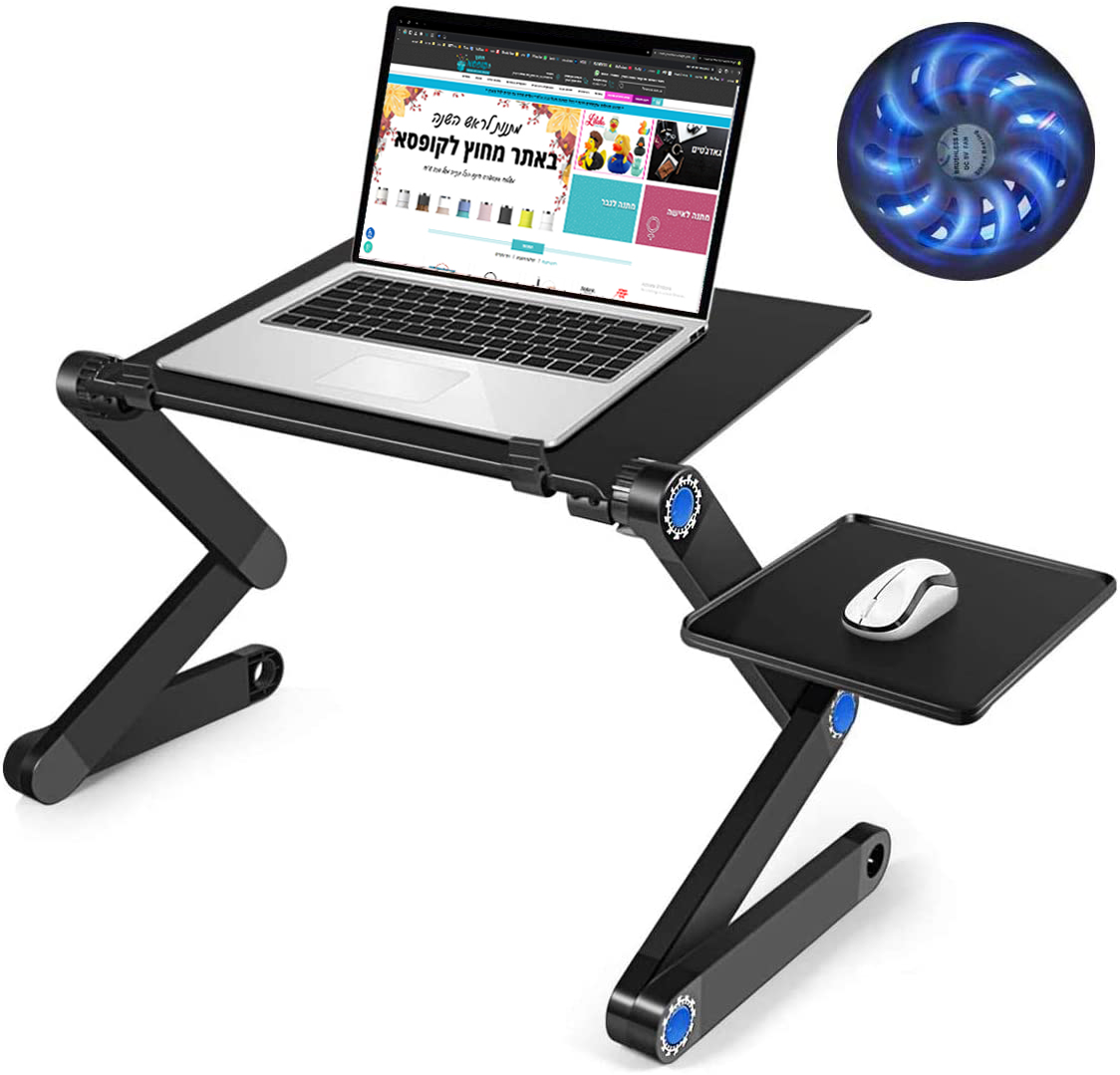 שולחן מחשב נייד מתקפל עם מאווררים לקירור המחשב, שולחן עבודה ארגונומי מתכוונן למחשב נייד עם מעמד נשלף לעכבר | מעמד לפטופ חזק הכולל זוג מאוורים העשוי שילוב של מתכת ופלסטיק קשיח הניתן להעמדה במבחר זוויות כמעט אין סופי ומתאים לאינספור שימושים: הנחה מעל בגובה השולחן, שכיבה בנוח על המיטה ועד עמידה. מתאים ללפטופ, מסך מחשב, מקרן ועוד ועוד.. מעמד ארגונומי מתכוונן ומתקפל למחשב נייד, מיוצר מאלומיניום איכותי וקל משקל. תורם ליציבה נכונה ומסייע בהפחתת כאבי צוואר וכתפיים. ניתן לקיפול ונשיאה ממקום למקום. רגליים מתכווננות 360° המאפשרות התאמה אידיאלית לצרכי המשתמש. משטח עליון מאוורר המאפשר זרימת אוויר מלאה בעת הצבת המחשב. משטח צדדי נשלף להצבת עכבר (לצד שמאל או ימין). מעמד למחשב נייד מעמד קשיח ומתכוונן ללפטופ | מגש פינוק | שולחן מחשב נייד למשרד | שולחן לפטופ ללימודים | שולחן לעבודה מתכוונן | שולחן מחשב עמידה | שולחן מחשב למיטה | שולחן ארגונומי | גאדג’טים למשרד | מתנות לעובדים | שולחן מחשב עבודה מהבית | שולחן מחשב נוח לגב | מגש מחשב לפטופ נוח לעבודה מהבית | עבודה מהבית
