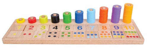 משטח עץ הגול הבנוי בצורת שעון מחוגים, מד זווית ומכיל צורות גיאומטריות צבעוניות ושונות עם מספרים.