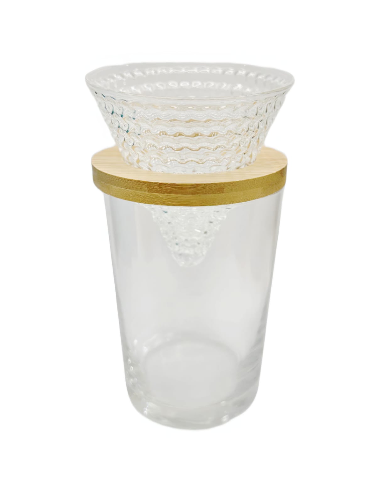 דריפר זכוכית לחליטת קפה פילטר, מתאים ל – 2-3 כוסות + טבעת מעץ + כוס זכוכית