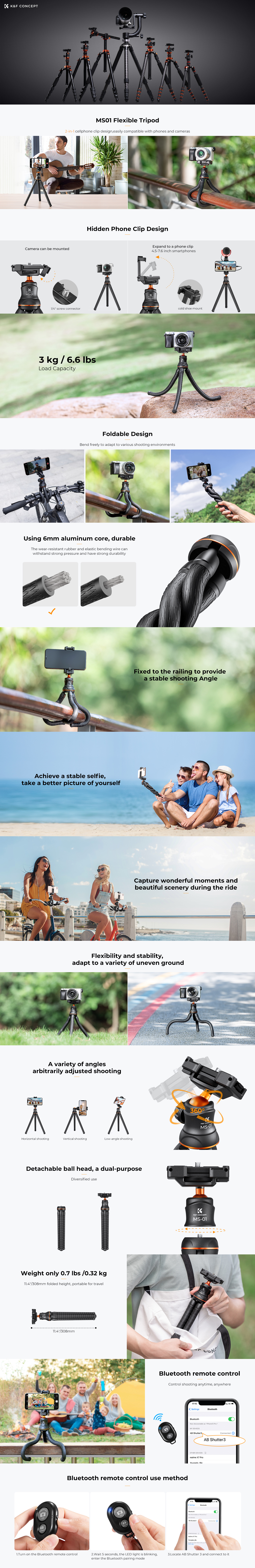 חצובה גמישה K&F Concept MS01 Octopus Flexible Tripod + Bluetooth Remote