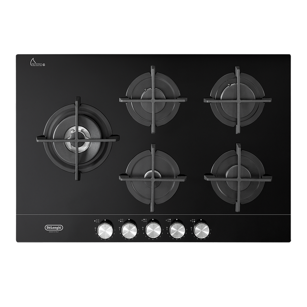 כיריים גז ברוחב 75 ס"מ דגם NSL575DNCM-IL של DeLonghi, זכוכית קרמית עמידה עם 9 דרגות חום לבישול מדוייק, 5 להבות גז בהספקים שונים כולל טורבו עוצמתי, הצתה אלקטרונית לכל מבער, חיישני בטיחות נפרדים לכל להבה, וראשים המתפרקים לשני חלקים לניקוי קל ויעיל!