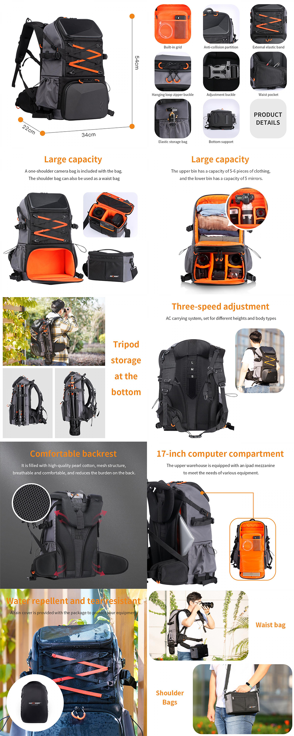 תיק גב לצילום / רב תכליתי מבית K&F Concept | נפח התיק 33L | תא מיוחד למחשב נייד עד גודל 17" | תא נוסף לטאבלטים עד 11" | תיק מחולק לשניים: לשימוש אישי + ציוד ציולום עם אפשרות לשלוף תא צילום ולהפוך אותו לתיק צד. ניתן להפוך את כל התיק לציוד אישי | כתפיות ניתנות לכיוון ע"י שלושה מצבים, לגבהים ואורכים שונים | תא מיוחד לחצובות גדולות | עשוי מחומר מיוחד 1200D Kouji Nylon המאפשר לאטימות נגד מים בדרגה 5 (כולל מגן גשם) | גודל התיק 34*22*54 ס"מ | משקל התיק 2.9 ק"ג