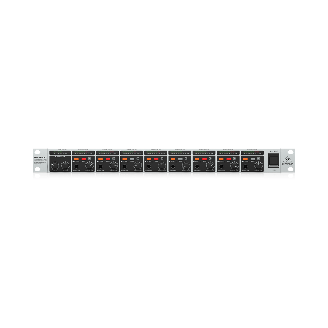 מגבר אוזניות מקצועי 8 ערוצים Behringer HA8000 V2 מגבר אוזניות עוצמתי במיוחד עם 8 ערוצים נפרדים, מיועד לאולפן ולהופעות. מאפשר שליחה של שני מיקסים ראשיים או עד 8 מיקסים נפרדים, עם שליטה עצמאית על כל ערוץ, מדדי עוצמה LED, אפשרות מונו,סטריאו, כניסות ויציאות קדמיות ואחוריות, וחיבור למגברים נוספים.