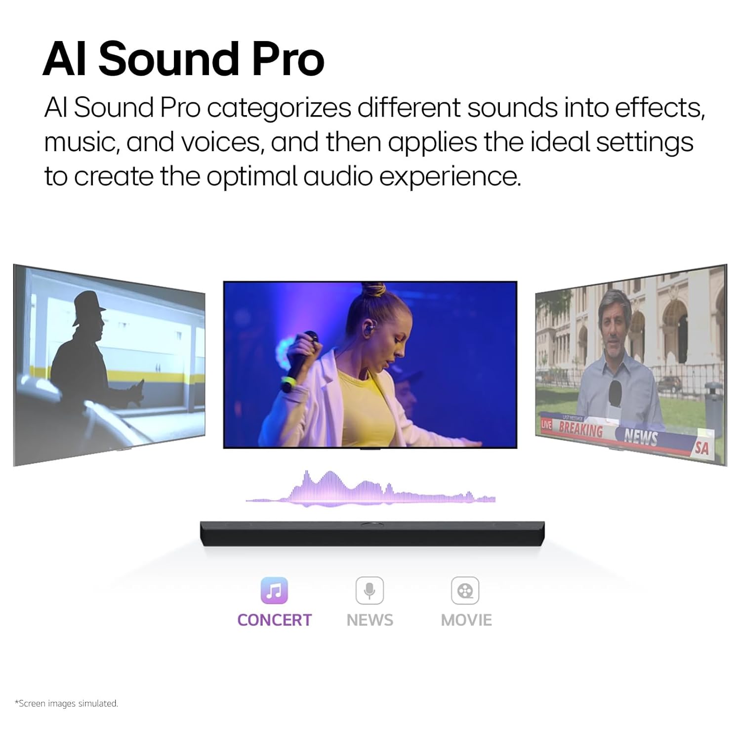 טכנולוגיית AI Sound Pro מסווגת את הצלילים השונים לאפקטים, מוזיקה וקולות, ובהתאם לכך מחילה את ההגדרות המתאימות ביותר ליצירת חוויית השמע האופטימלית.