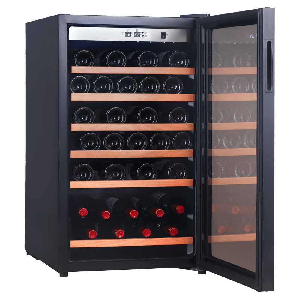 מקרר יין מדחס המיועד לאחסון 32 בקבוקי יין לבן ואדום.
