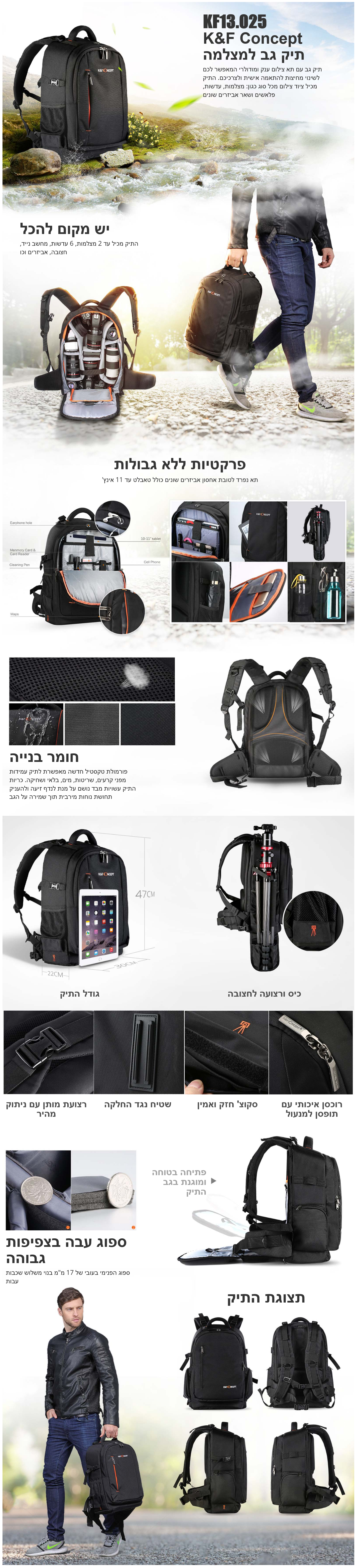 תיק גב איכותי ומעוצב לציוד צילום ואביזרים אישיים מבית K&F Concept. תיק מרווח יכול להכיל גוף מצלמת DSLR או מצלמה ללא מראה (Mirrorless) אחת או שתיים, יחד עם 6 עדשות פריים ועדשת זום אחת. ישנו תא מיוחד ומרופד להפליא עבור מחשב נייד בגודל 13 אינץ’ וכן תא קדמי וכיסים צדדיים לטאבלטים, מסמכים, סוללות, כבלים, פילטרים לעדשה, בקבוק מים ועוד. פיתרון עבור נשיאת חצובת טיולים ע"י לולאות הידוק איכותיות בגימור חום. תיק צילום זה עשוי פוליאסטר בדרגה גבוהה ואילו החלק החיצוני של התיק עמיד מפני פגעי מזג אוויר (weather resistant). רצועות כתף בצורת H להידוק התיק אל הגוף באופן האולטימטיבי למטיילים ואבזם נעילה, המעניקים אחיזת גוף טובה יותר כאשר אתם באיזור אתגרי או מטיילים להנאתכם. רצועות הכתף איכותיות ונוחות מאוד, נושמות ומנדפות זיעה ותורמות לפיזור המשקל באופן אחיד.