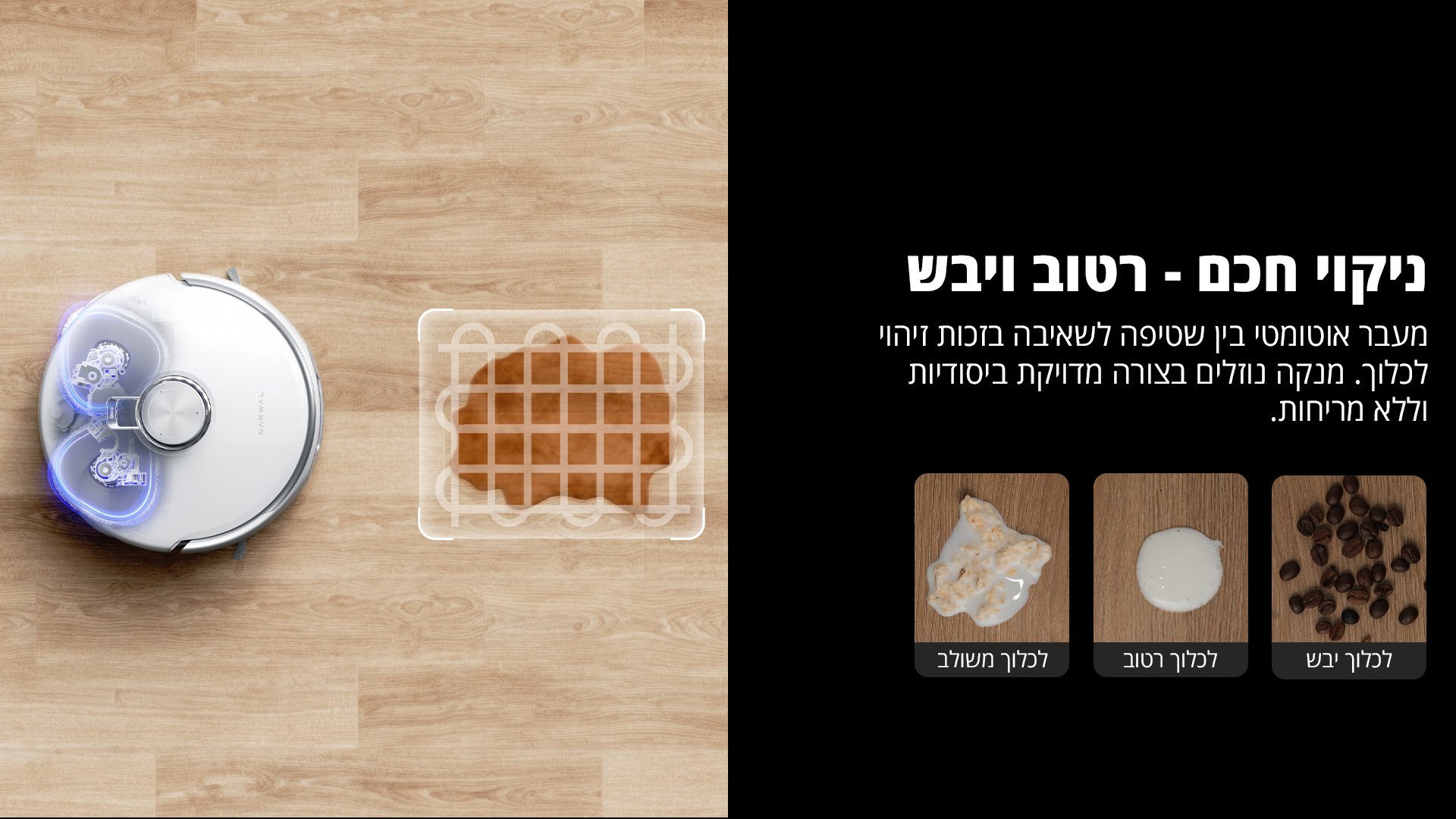 מעבר אוטומטי בין שטיפה לשאיבה בזכות זיהוי לכלוך. מנקה נוזלים בצורה מדויקת ויסודית וללא מריחות.