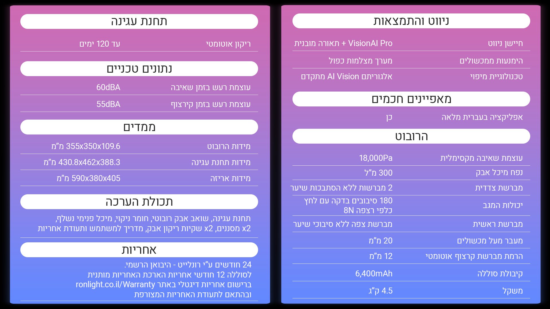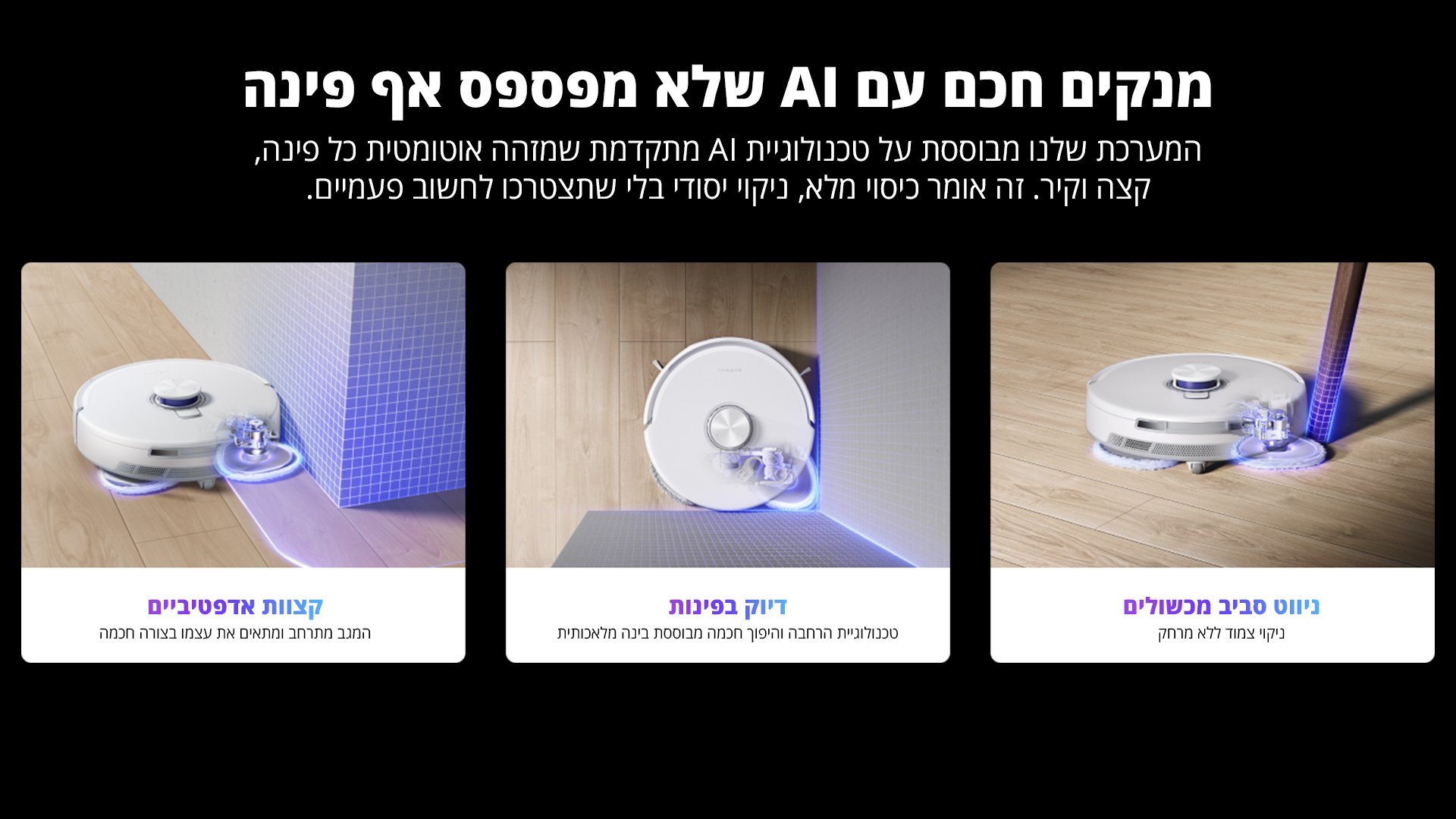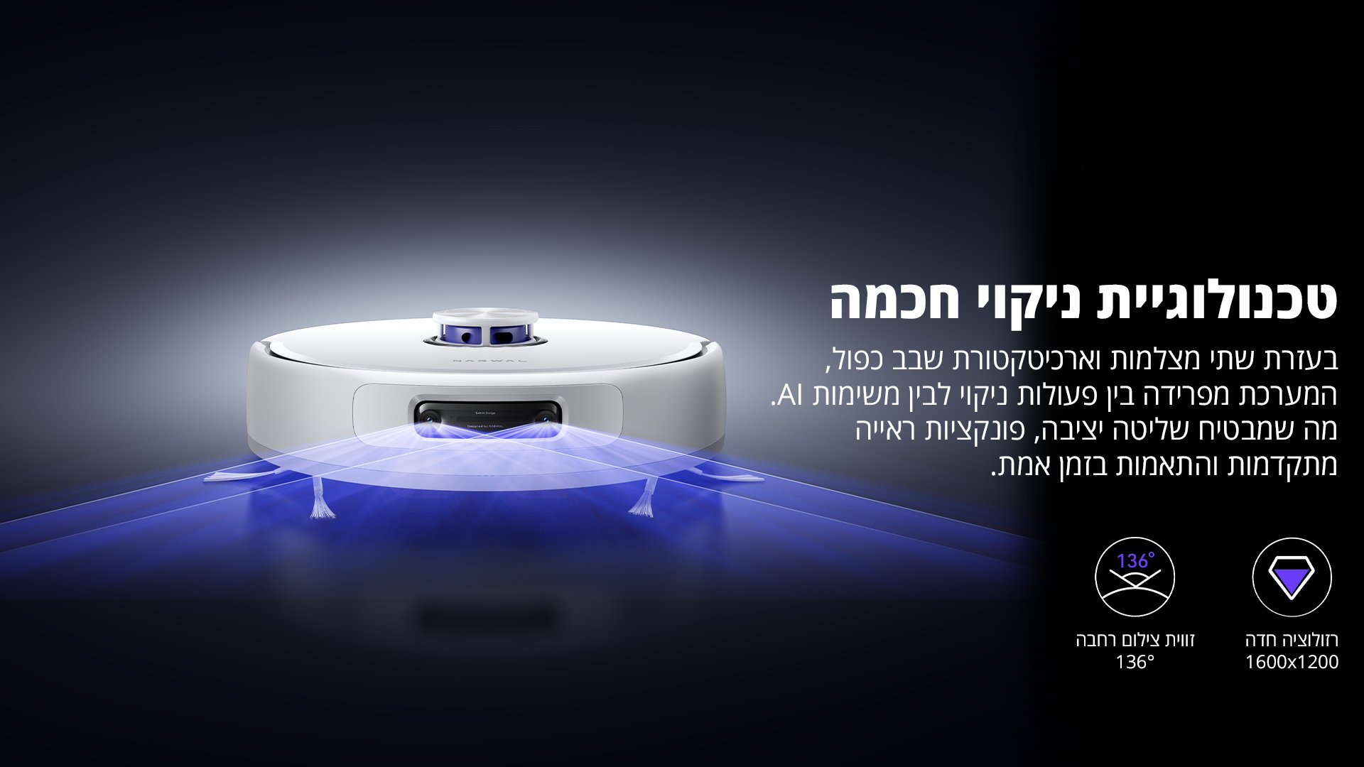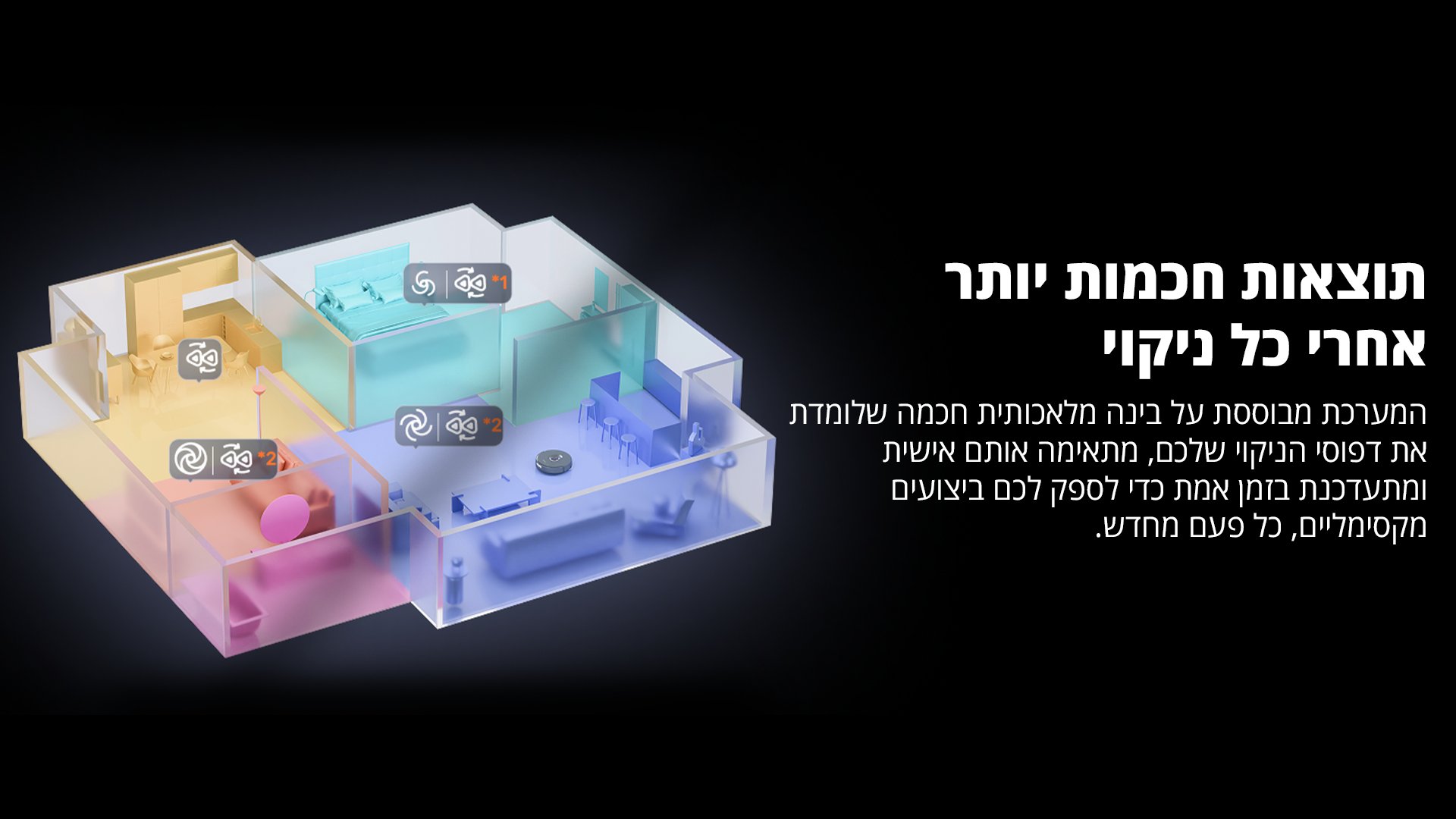 המערכת שלנו מבוססת על טכנולוגיית AI מתקדמת שמזהה אוטומטית כל פינה, קצה וקיר. זה אומר כיסוי מלא, ניקוי יסודי בלי שתצטרכו לחשוב פעמיים.