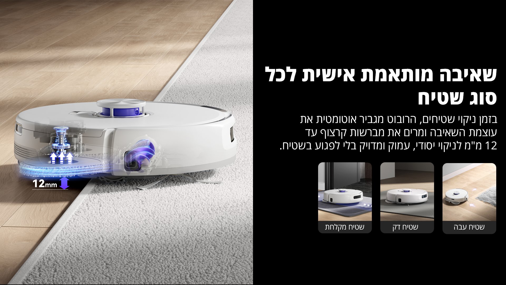 בזמן ניקוי שטיחים, הרובוט מגביר אוטומטית את עוצמת השאיבה ומרים את מברשות הקרצוף עד 12 מ"מ לניקוי יסודי, עמוק ומדויק בלי לפגוע בשטיח.