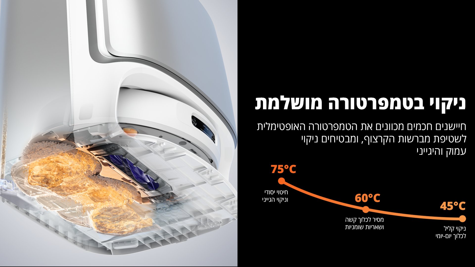 חיישנים חכמים מכוונים את הטמפרטורה האופטימלית לשטיפת מברשות הקרצוף, ומבטיחים ניקוי עמוק והיגייני.