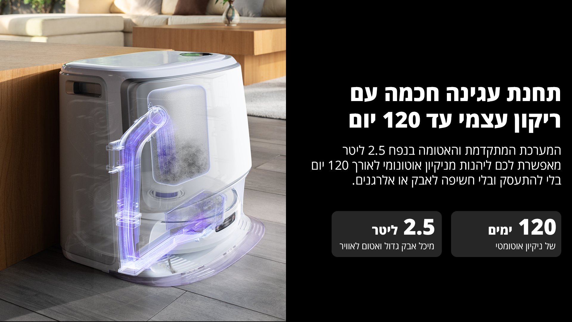 המערכת המתקדמת והאטומה בנפח 2.5 ליטר מאפשרת לכם ליהנות מניקוי אוטונומי לאורך 120 יום בלי להתעסק ובלי חשיפה לאבק או אלרגנים.