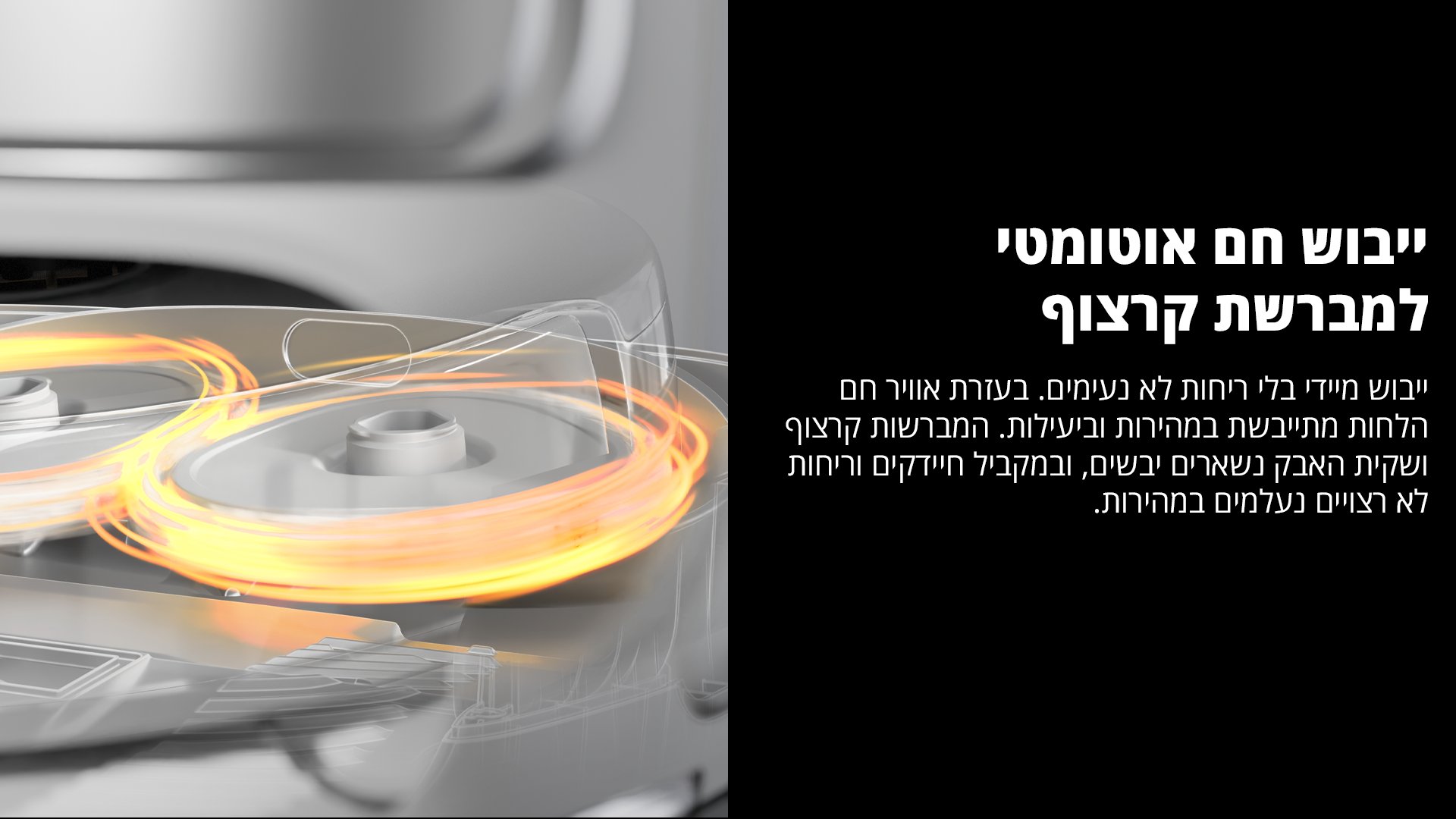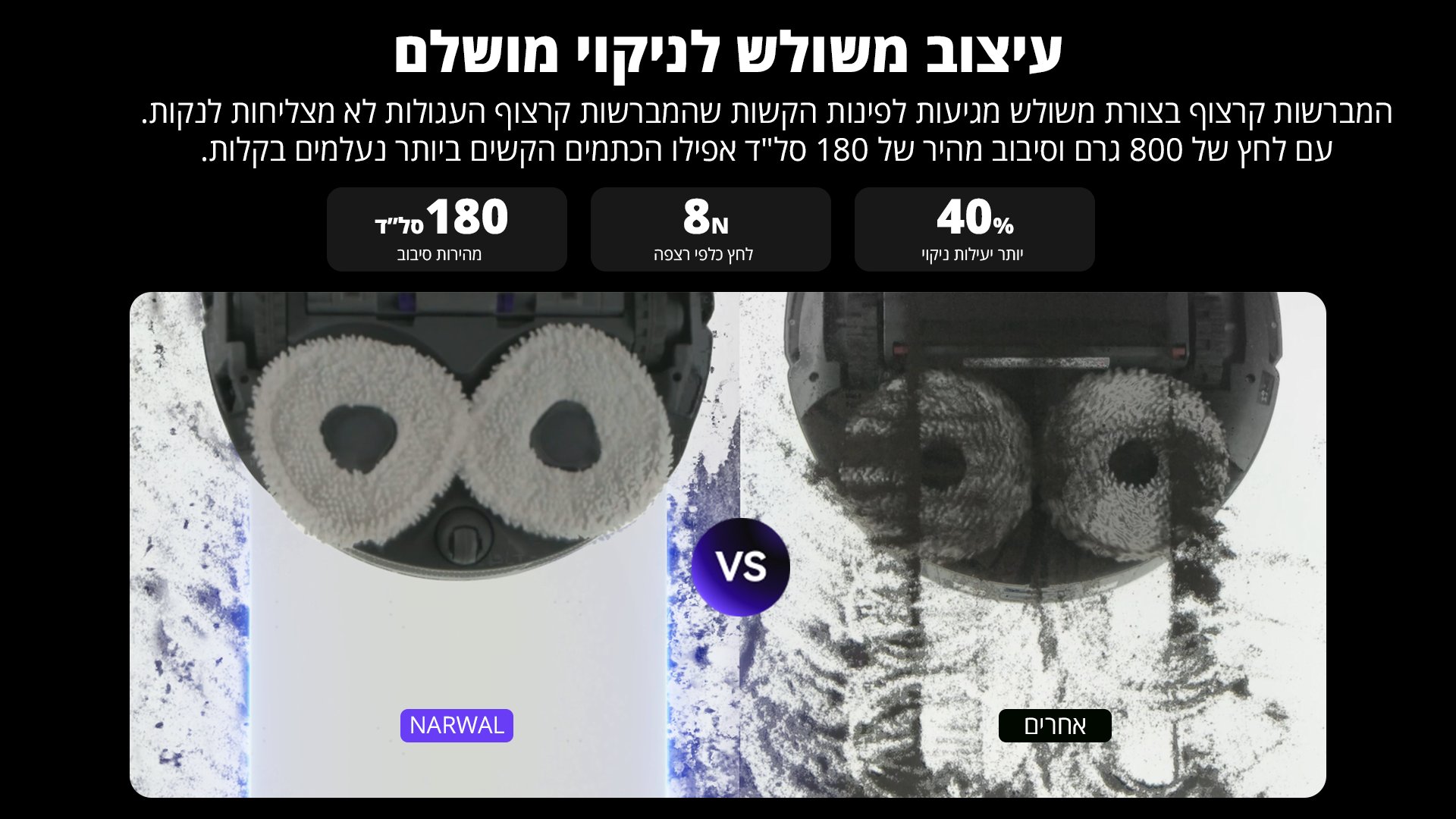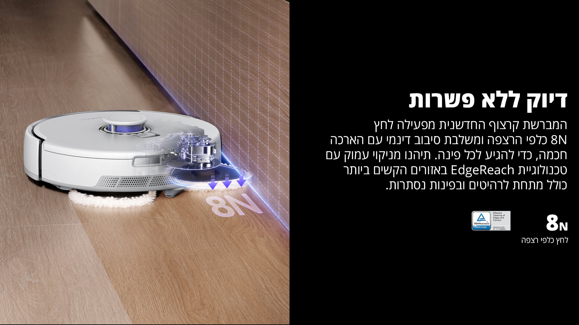 המברשת קרצוף החדשה מפעילה לחץ 8N כלפי הרצפה ומשלבת סיבוב דינמי עם הארכה חכמה, כדי להגיע לכל פינה.