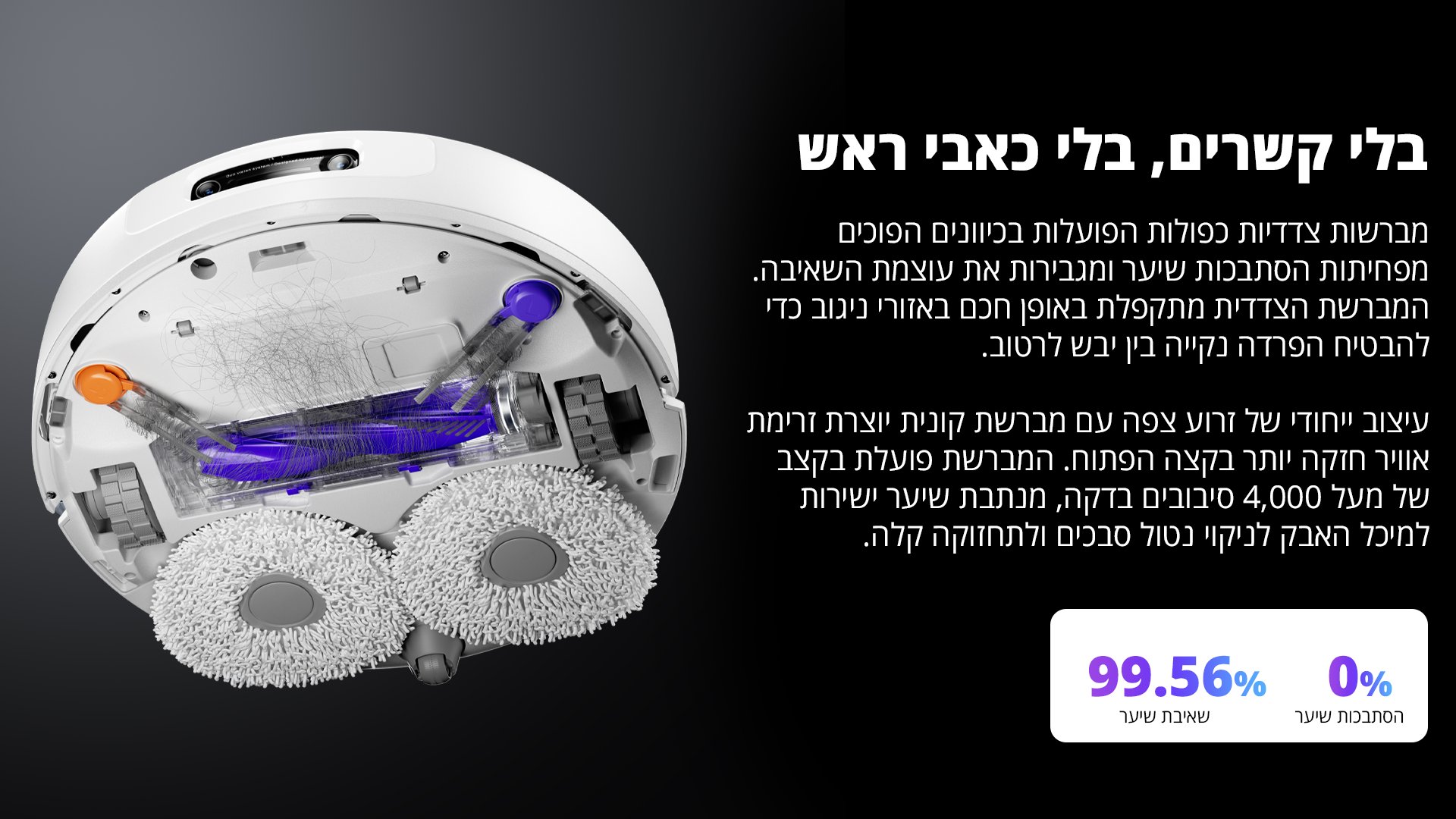 מברשות צדדיות כפולות פועלות בכיוונים הפוכים, מפחיתות הסתבכות שיער ומגבירות את עוצמת השאיבה.