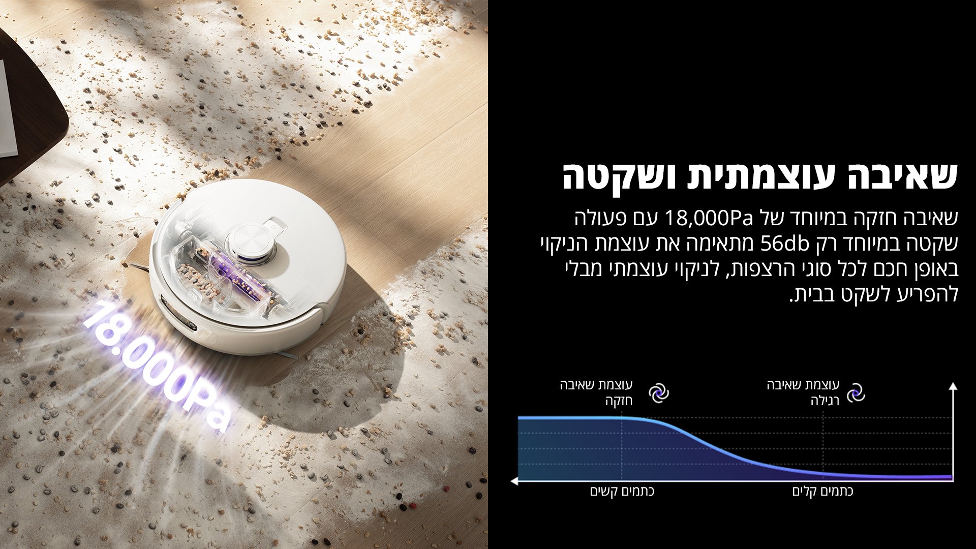 שאיבה חזקה במיוחד של 18,000Pa עם פעולה שקטה במיוחד של 56db מתאימה את עוצמת הניקוי באופן חכם לכל סוגי הרצפות, לניקוי עוצמתי מבלי להפריע לשקט בבית.