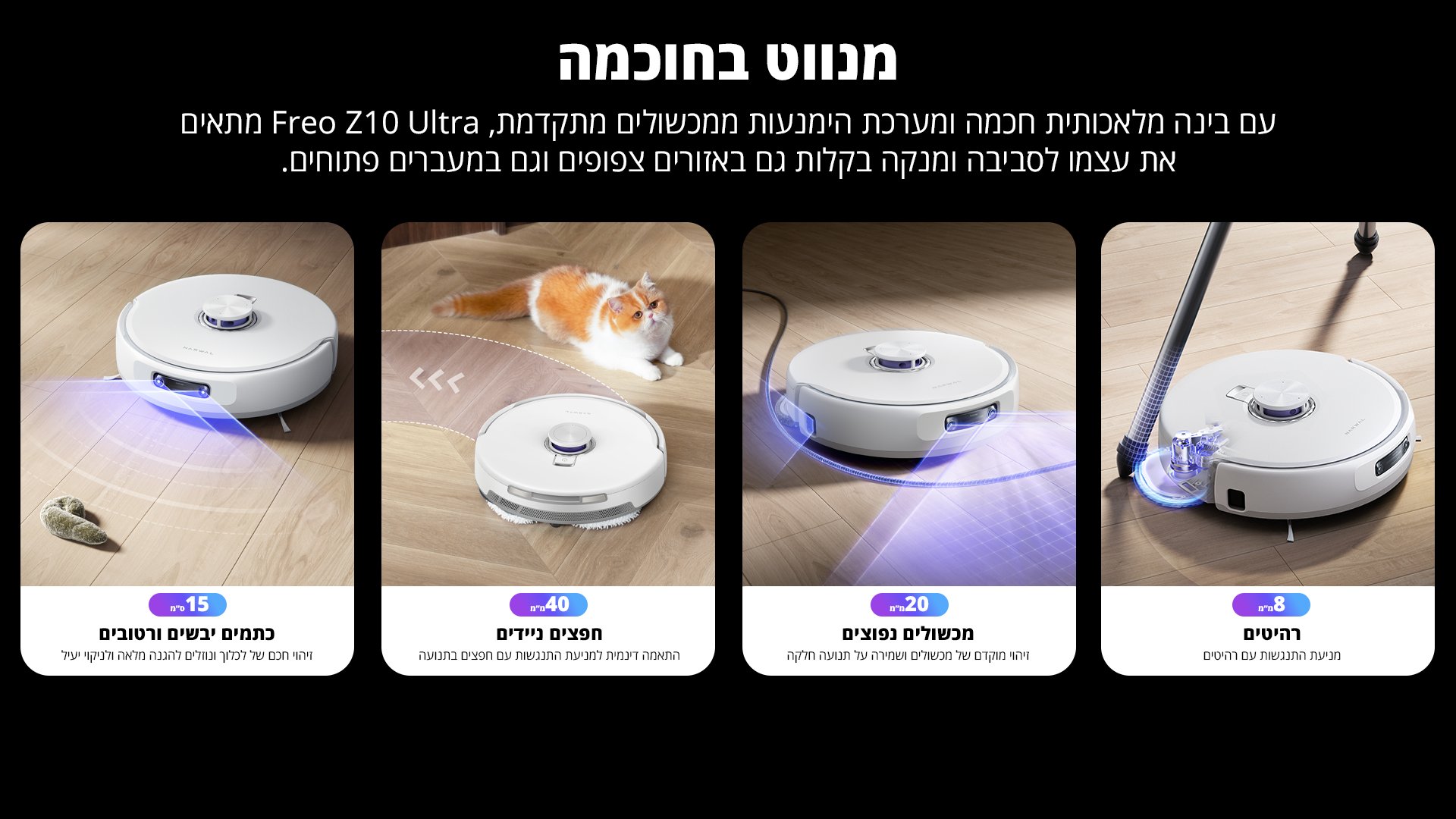 עם בינה מלאכותית חכמה ומערכות הימנעות מתקדמות, Freo Z10 Ultra מתאים את עצמו לסביבה ומנקה בקלות גם באזורים צפופים וגם במעברים פתוחים.