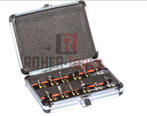 מקצוע 82 מ"מ 750W + סט 12 סכינים לרוטר/טרימר במזוודת אלומיניום + סט 12 יחידות כרסומי עץ לרוטר/טרימר + תפסנית 1/4 לרוטר =