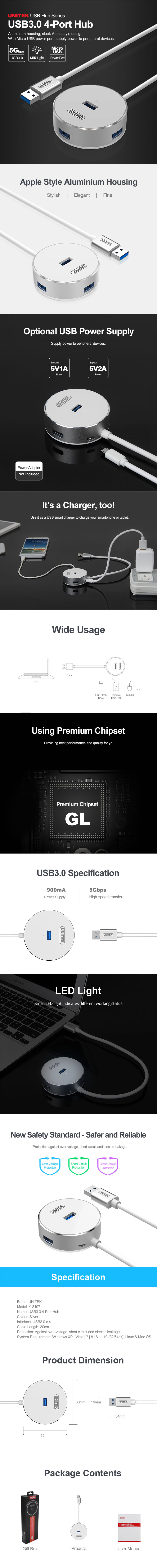 מפצל Unitek Y-3197 USB3.0 4-Port Aluminium Hub