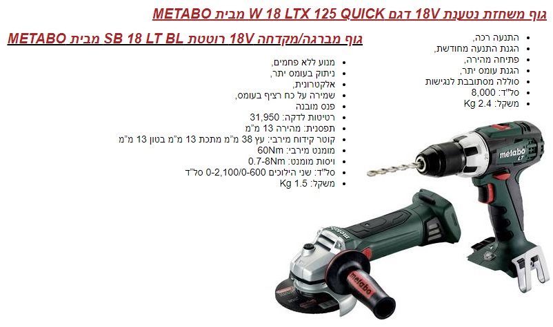 סט גופים מברגה + משחזת Metabo BS 18 LT + W 18 LTX 125 Quick