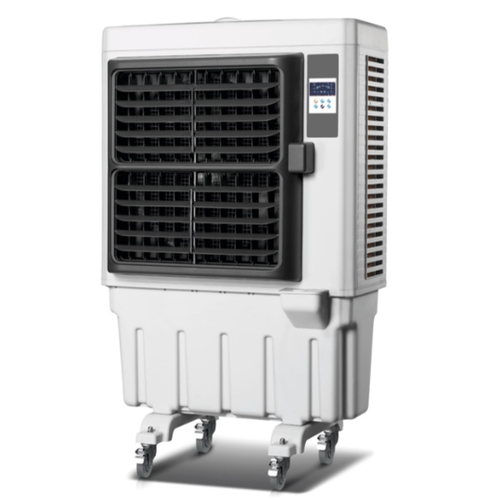 מצנן אוויר חזק ועצמתי, תעשייתי עם מבנה פלסטי מחוזק. פתרון נהדר לגני אירועים, אולמות וחצרות, בתי עסק, תעשייה, מוסדות וכד’. כולל גלגלים לניוד ושינוע בקלות ובנוחות. 3 כניסות אויר. חסכוני במים. צג דיגיטלי לחיווי נוח+שלט, ספיקת אוויר 15,000 מטר לשעה, הספק 400W, גודל מיכל 75 ליטר, איזור כיסוי 50-80 מ"ר, 585W*535D*1440H. כולל תא לקרחונים להגברת עוצמת הקירור, שלט וסנפיר / מצוף להתראת מחסור במים, מתאים לתעשייה, קניונים, משתלות, מוסדות אולמול אירועים, מחסנים כול חלל גדול אחר, מותאם לשעון שבת