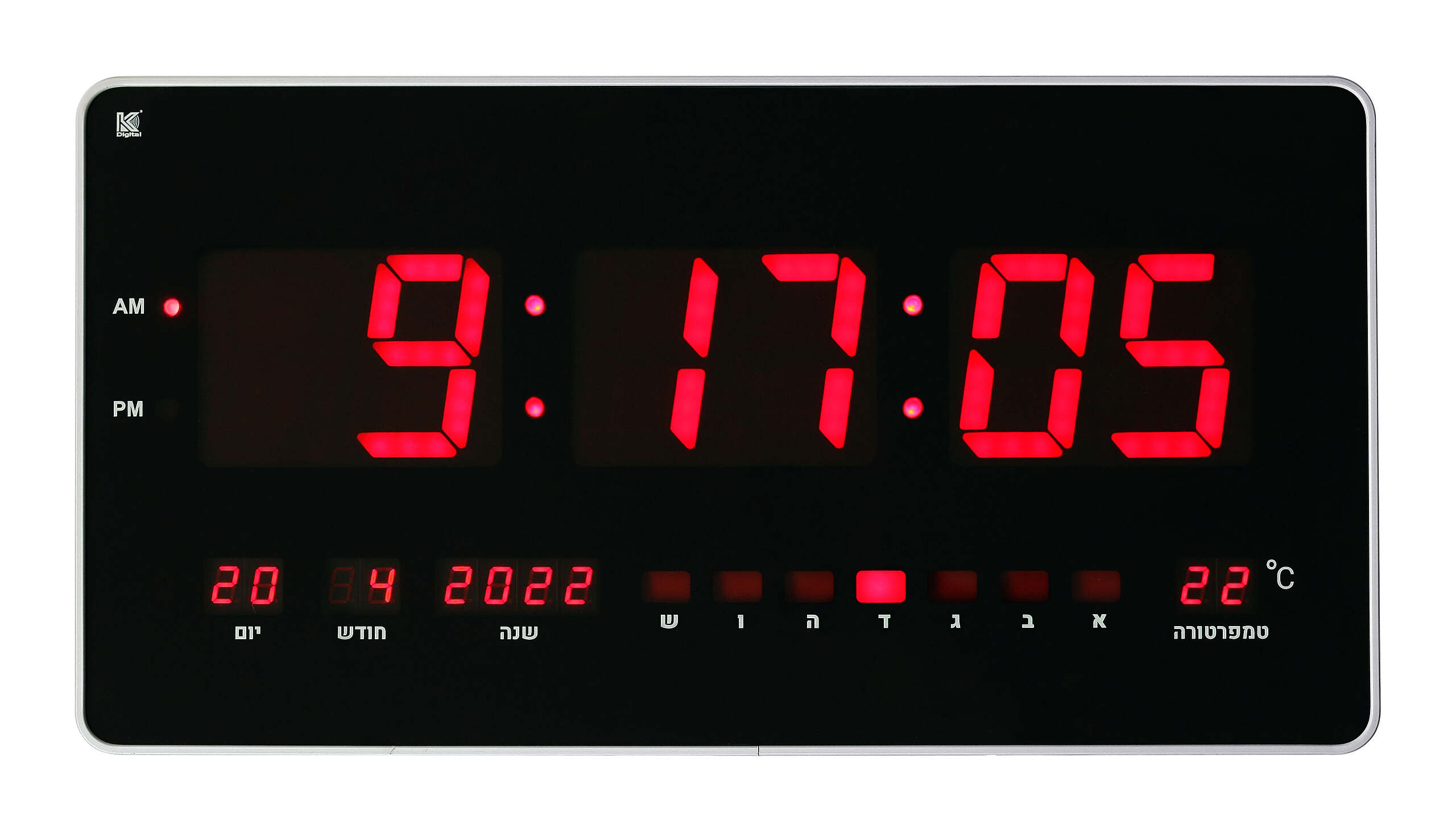שעון קיר דיגיטלי דגם טוקיו GF9595 מבית KDigital. שעון קיר דיגיטלי מעוצב, מרשים וחדשני במיוחד הכולל את הפיצ’רים הבאים: – שעה – יום / לילה (AM / PM) – טמפרטורת החדר – יום בשבוע – לוח שנה (יום, חודש, שנה) – תצוגה בעברית – תאורת LED בצבע אדום – בהירות אוטומטית בהתאם לסביבה – סוללת גיבוי מובנית לשמירת הגדרות עד 100 שעות במצבים של הפסקות חשמל מתאים לבתים, משרדים, מוסדות חינוכיים ועסקים – עם תצוגה ברורה הנראית מרחוק. שעון קיר דיגיטלי דגם טוקיו מוזן ע"י חיבור ישיר לשקע חשמל – מצורף שנאי. כולל מעמד שולחני מתנה!