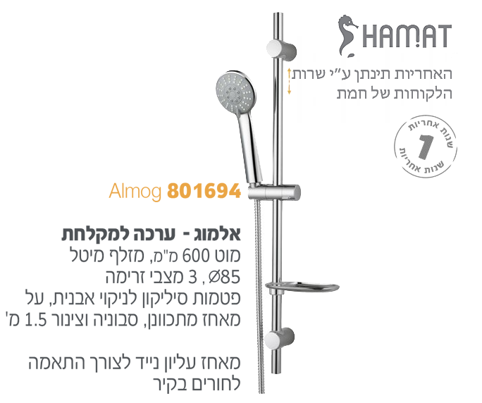 אלמוג – ערכה למקלחת מוט 600 מ"מ, מזלף מיטל 85, 3 מצבי זרימה פטמות סיליקון לניקוי אבנית, על מאחז מתכוונן, סבוניה וצינור 1.5 מ’.