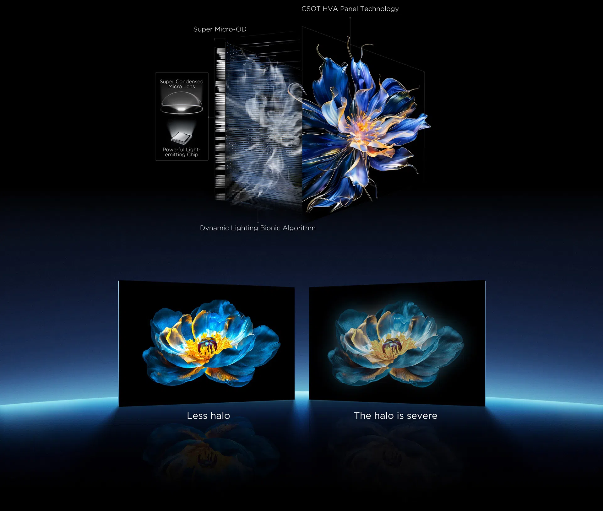 סדרת Precise Dimming מתייחסת למסך Mini LED עם טכנולוגיית בקרת הילה מקיפה. הדור החדש של שבב פולט אור רב עוצמה, עדשת מיקרו סופר-דחוסה ו-Super Micro-OD הופכים את צורת האור של אזורים בודדים למושלמת יותר, ויכולת בקרת ההילה שלו גדולה פי כמה מזו של אזורים רגילים.